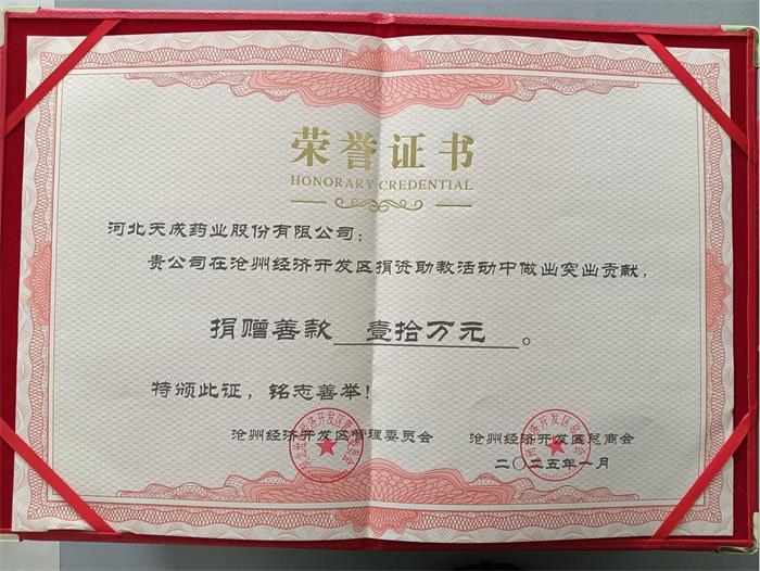 2024年,在滄州經(jīng)濟(jì)開發(fā)區(qū)黨工委、管委會(huì)的引領(lǐng)以及市委統(tǒng)戰(zhàn)部、市工商聯(lián)的指導(dǎo)下,天成藥業(yè)協(xié)同園區(qū)各會(huì)員單位攜手奮進(jìn)。憑借各方的共同努力,區(qū)總商會(huì)榮獲滄州市“四好”商會(huì)稱號(hào),天成藥業(yè)也成功入圍2024河北省民營(yíng)企業(yè)百?gòu)?qiáng)系列榜單。