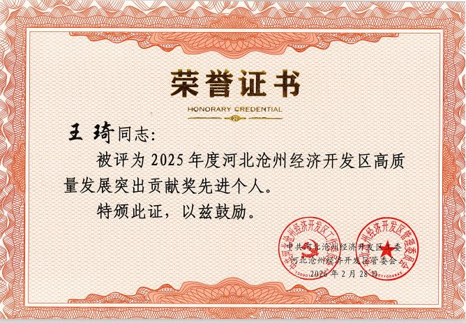 近日,中共河北滄州經(jīng)濟(jì)開(kāi)發(fā)區(qū)工委、滄州經(jīng)濟(jì)開(kāi)發(fā)區(qū)管委會(huì)聯(lián)合發(fā)布《關(guān)于表彰2025年度高質(zhì)量發(fā)展突出貢獻(xiàn)獎(jiǎng)先進(jìn)集體和先進(jìn)個(gè)人的決定》,河北天成藥業(yè)股份有限公司執(zhí)行總裁兼企業(yè)經(jīng)營(yíng)中心總經(jīng)理王琦獲評(píng)2025年度滄州經(jīng)濟(jì)開(kāi)發(fā)區(qū)高質(zhì)量發(fā)展突出貢獻(xiàn)獎(jiǎng)先進(jìn)個(gè)人,以實(shí)干擔(dān)當(dāng)彰顯企業(yè)管理者的先鋒力量。
