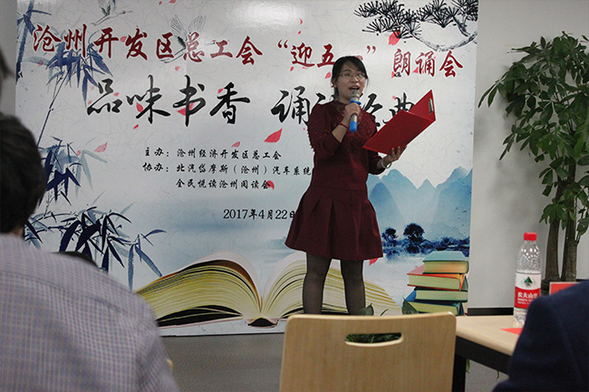2017年4月22日,滄州開發(fā)區(qū)總工會(huì)主辦,北汽岱摩斯(滄州)汽車系統(tǒng)有限公司工會(huì)、全民悅讀滄州閱讀會(huì)協(xié)辦的“迎五一誦讀會(huì)”如期舉行。此次朗讀會(huì)主題為“品味書香,誦讀經(jīng)典”,是為打造滄州東部新城,在開發(fā)區(qū)推廣全民閱讀的一次嘗試。我公司職工劉艷麗、鄭福貴分別在會(huì)上深情朗讀了詩(shī)歌《相信未來(lái)》、《希望,展翅飛翔》。